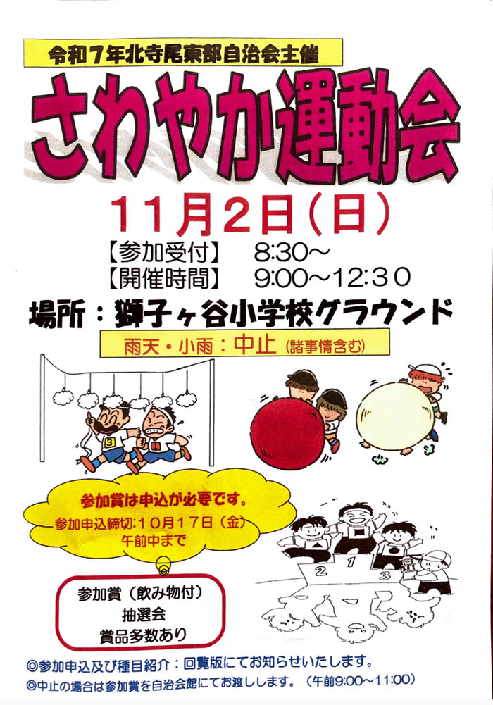 さわやかな気候の中、日常から離れて思いっきり身体を動かして、汗を流してみませんか?🤗 景品も🎁🎁たくさん用意しております~~🎵申込みは回覧板による申込書にてお願いいたします。なお、お申込みがない場合は、参加品をお渡しできませんので必ず申込みをお願い致します_(._.)_