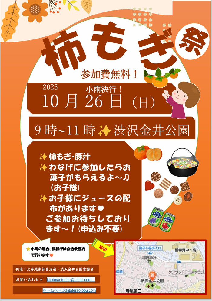 10月26日(日)9時~11時から、渋沢金井公園にて、柿もぎ祭りを開催します(*^_^*)