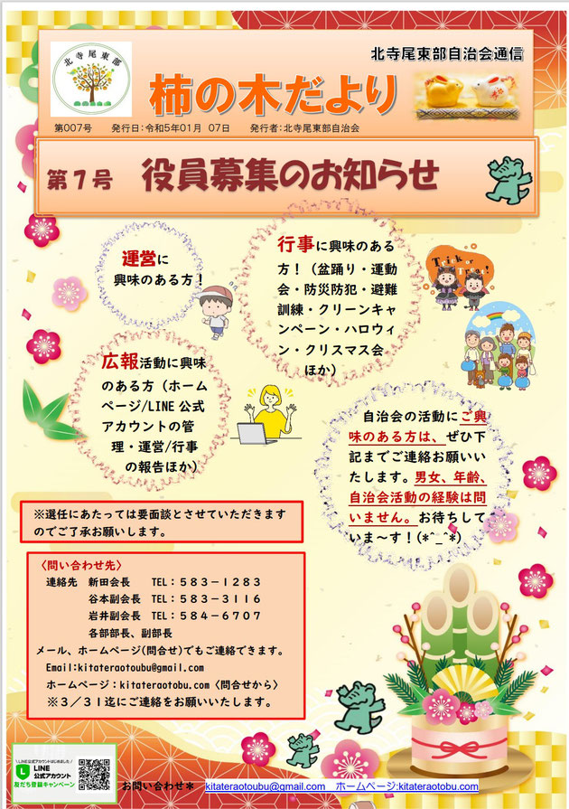 2023/01/08 柿の木だより7号「役員募集のお知らせ」 2023/01/08 NEW 柿の木だより第7号「役員募集のお知らせ」を発行致しました。自治会に少しでもご興味がおありの方、ぜひご連絡をお願い致します。お待ちしております~🌺 tagPlaceholderカテゴリ: 2022年度ブログ